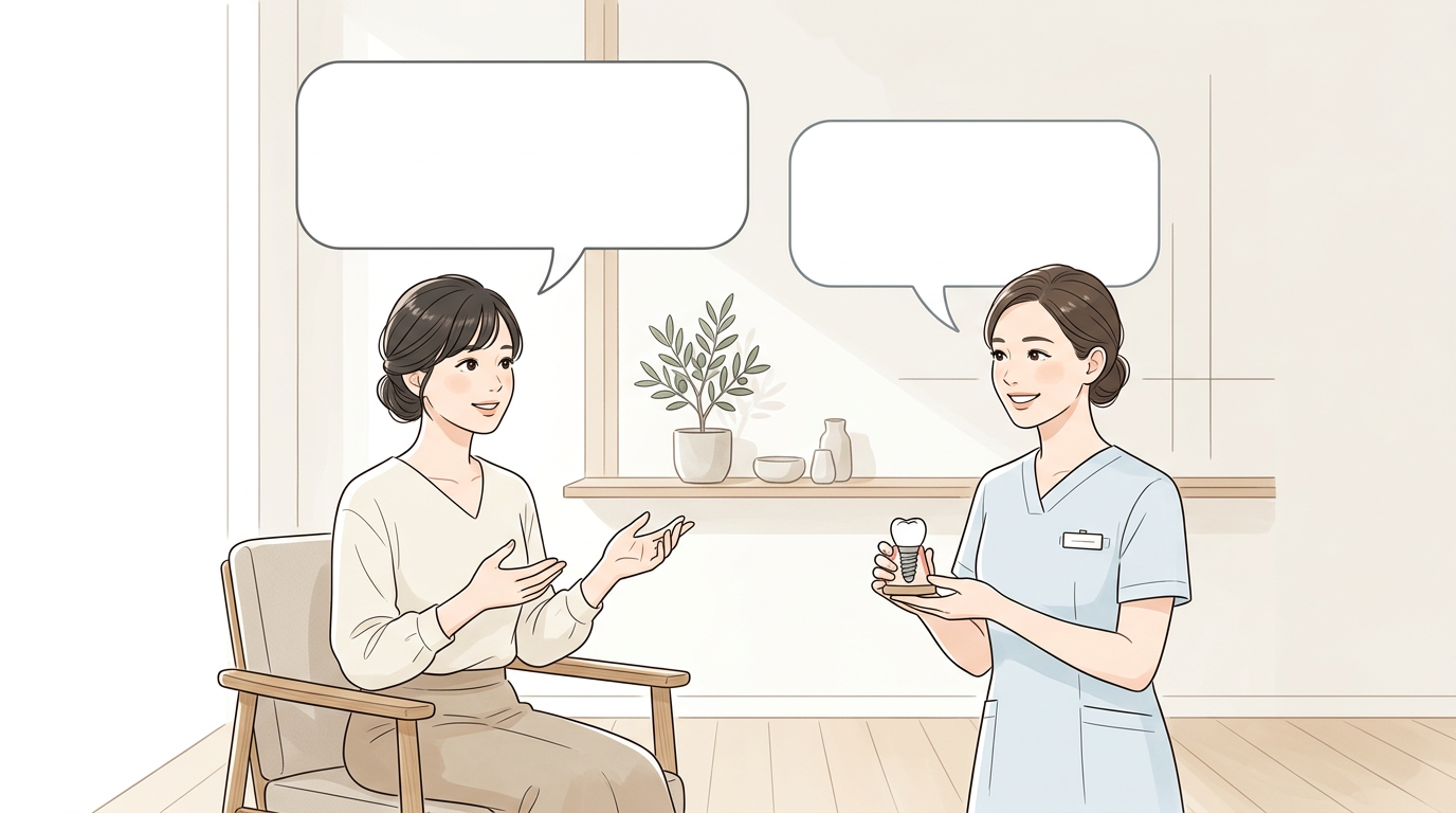 インプラント1本あたりの手術時間は約30分〜1時間程度です。本数が増えたり、骨造成手術が追加される場合はその分時間がかかります。事前のカウンセリングでおおよその所要時間をご案内いたします。