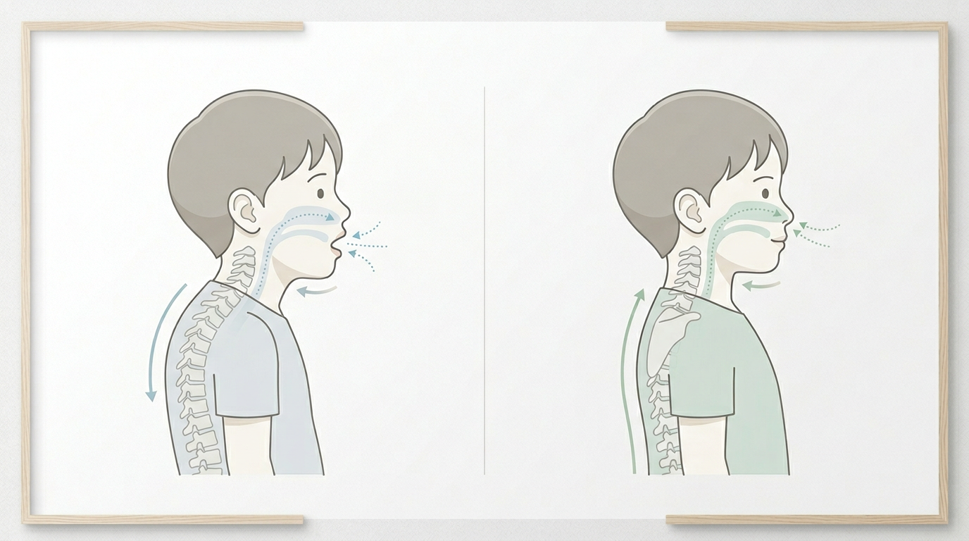 姿勢が悪いと、頭の位置が前にずれて顎に負担がかかり、 咬合(噛み合わせ)が変化します。特に子どもの成長期には、悪い姿勢が骨格の発達に直接影響します。