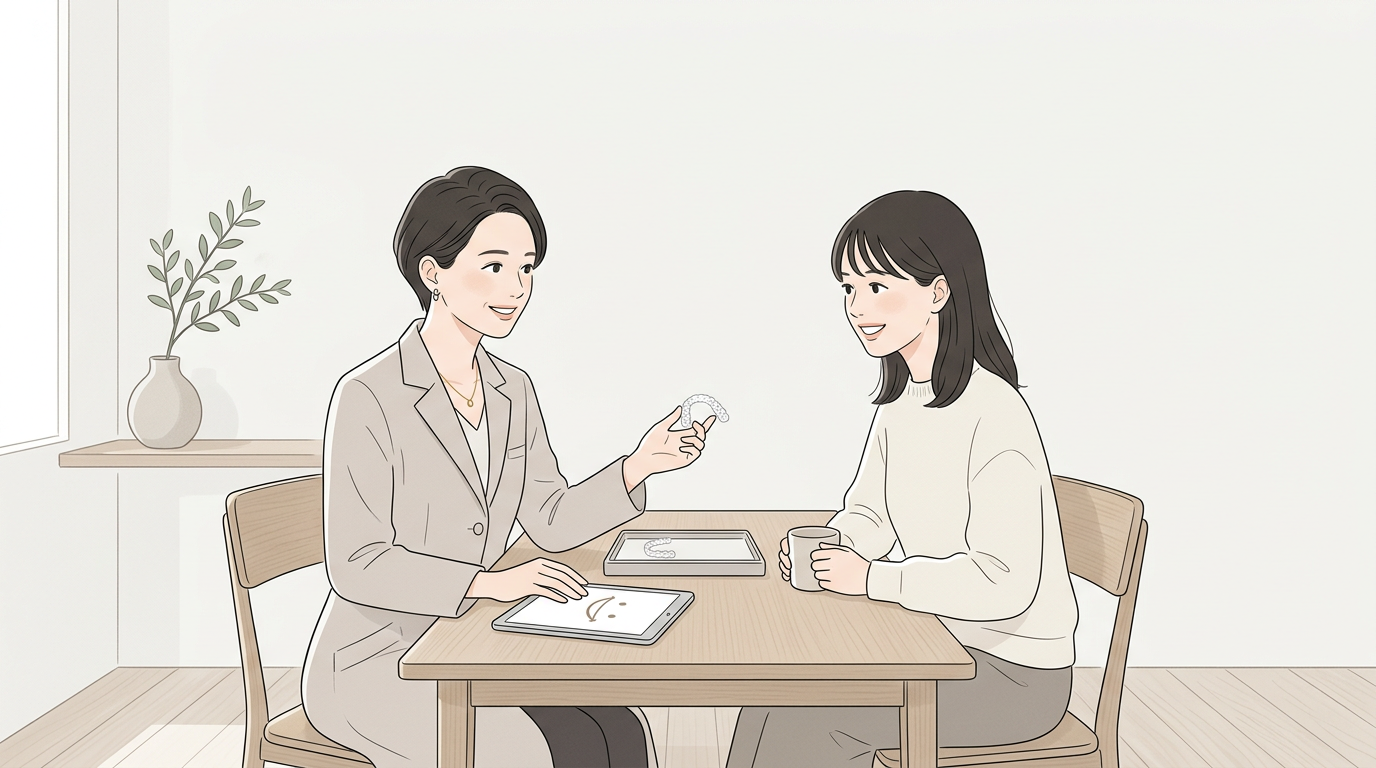 歯並びのお悩みやご希望を伺い、マウスピース矯正が適しているか簡易診断を行います。ワイヤー矯正との違いもご説明します。